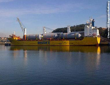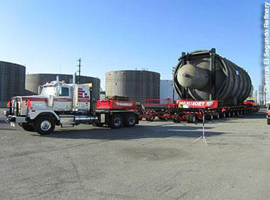 El Segundo. When you hear the name of this beachfront Southern California city (estimated population 16,775), bounded by Manhattan Beach and Los Angeles International Airport, you may very well think of an oil refinery. Even the translated name of the city—”The Second”—is a reference to its historical link to the local refinery, the second to be constructed in California by Standard Oil (now Chevron). More than 100 years old, the refinery today produces roughly 20 percent of the motor fuel used in Southern California and 40 percent of the jet fuel used at Los Angeles International Airport. With roots so deep and going back so far, it makes sense that equipment at the refinery that has reached the end of its service life is efficiently replaced. This is exactly what is happening to the refinery’s six enormous coke drums, which are 45 years old. Their replacements are being transported by barge from Los Angeles to nearby King Harbor, in Redondo Beach, and from there are being conveyed 4.5 mi overland to the Chevron El Segundo Refinery.